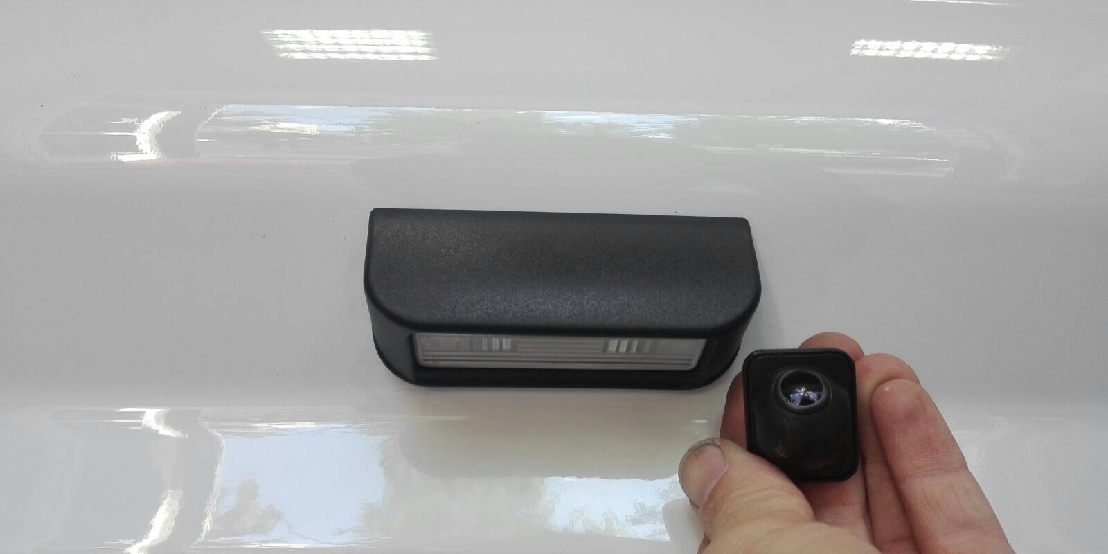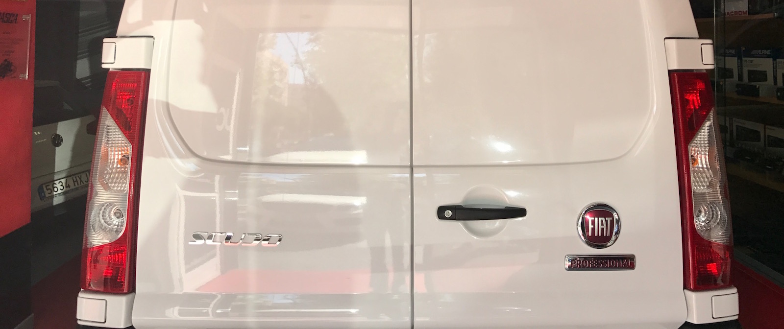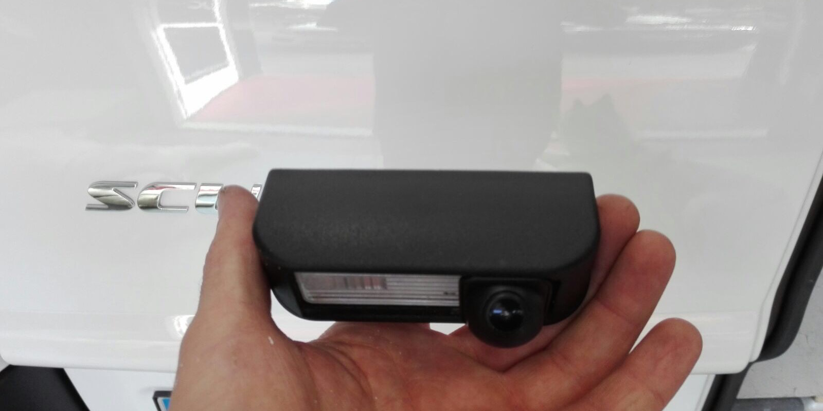 Fiat Scudo, instalación de espejo retrovisor-monitor de 5″ para visualización de cámara de visión trasera integrada en luz de matrícula.